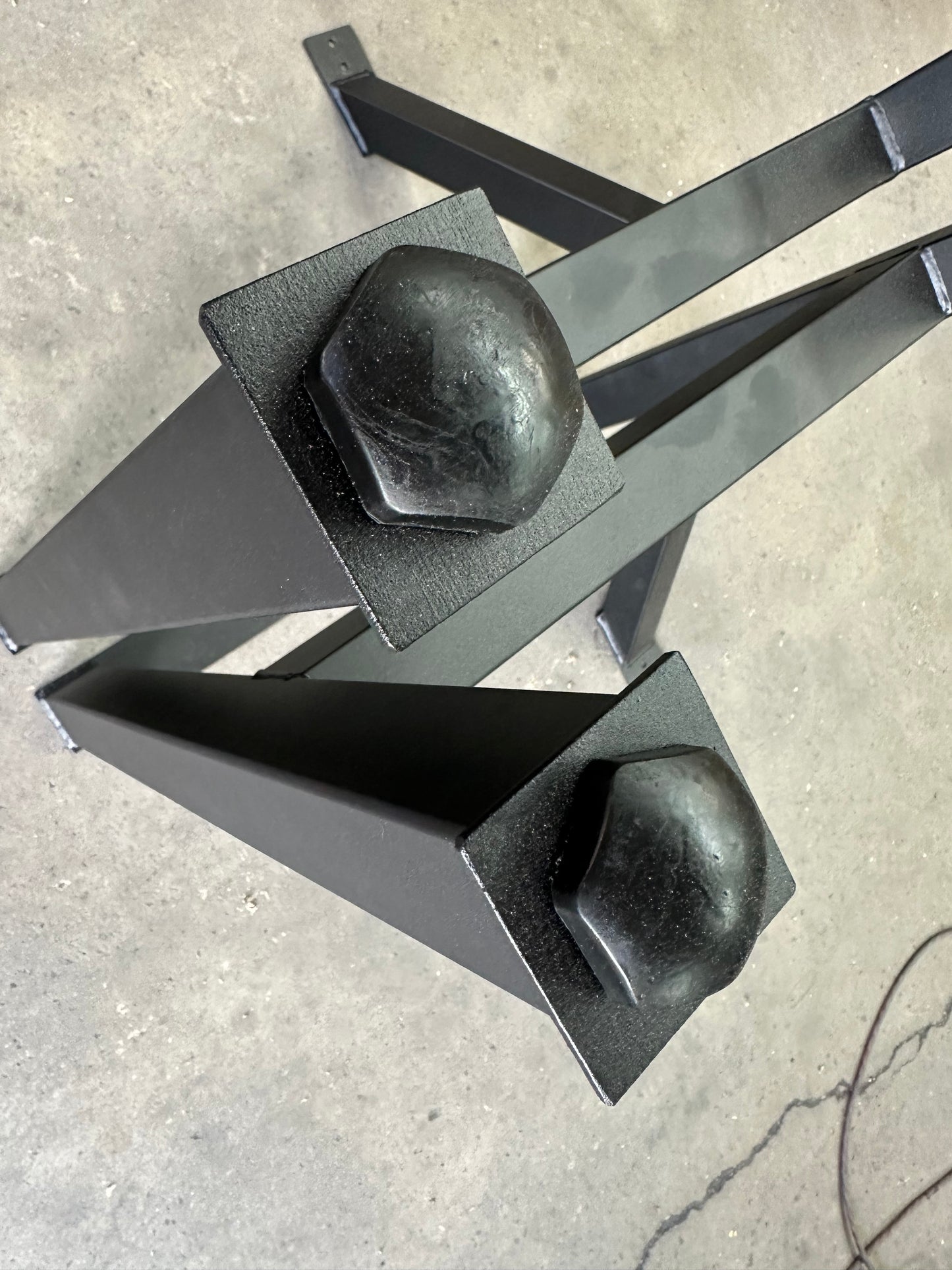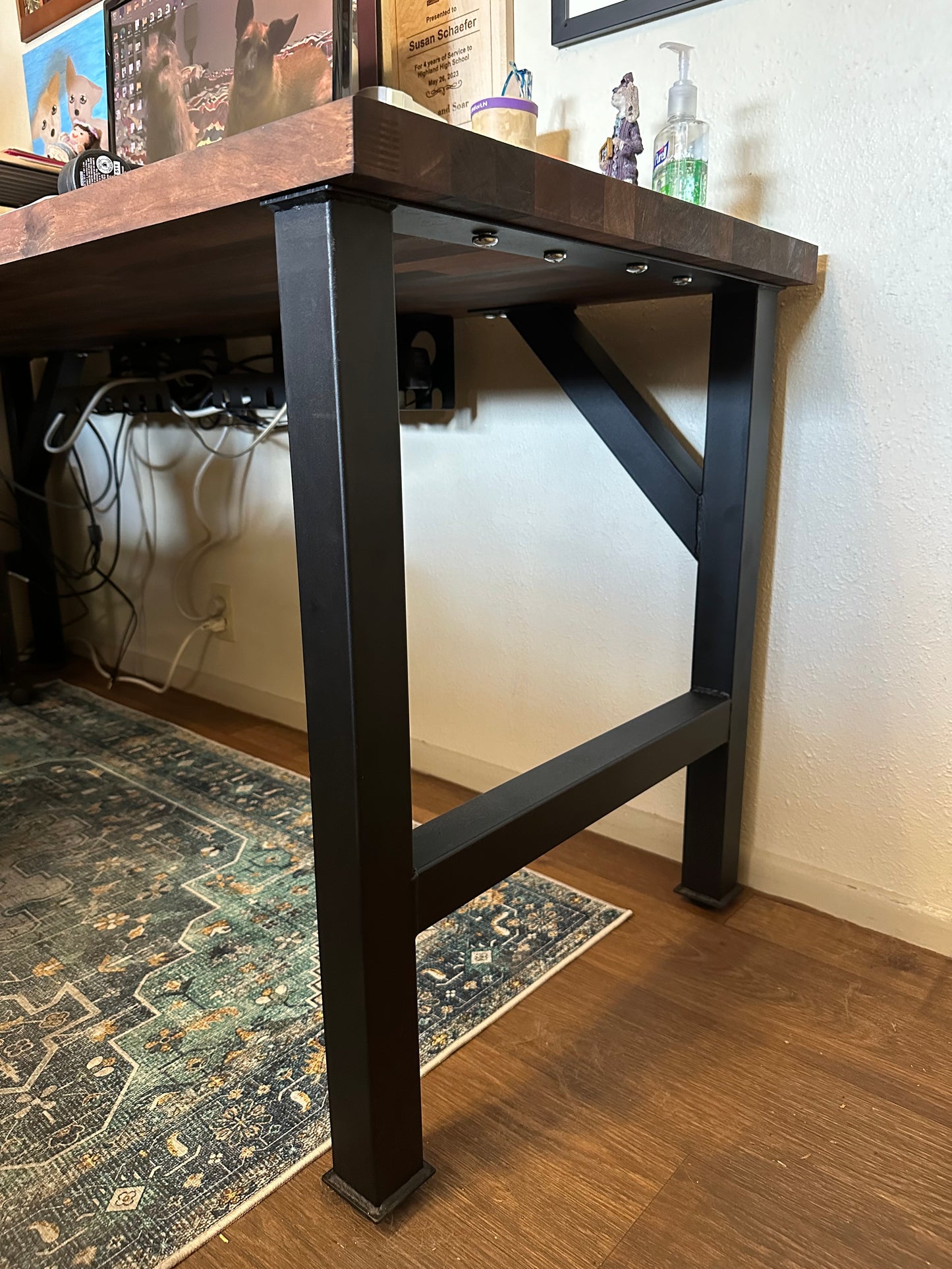 Solid European Walnut Butcher Block Desk. 74" Long x 25" Wide x 1.5" Thick. We made a custom set of legs with 45 degree support arms. Legs and angled support are made from 2"x2" square steel tube with a 1/16" thick wall. Powder Coated in a textured wrinkle finish black. Feet are automotive bump stops made from polyurethane and will not damage any floor surface. Legs are secured to the butcherblock with machine screws and the wood has Rampa Tech threaded inserts. Desk can be dis-assembled and re-assembled without loosing any integrity as the machine screws go into actual metal threads. Not the wood. Cable Management hangers attached to underside. Sanded down to 280 grit on both sides and 4 hand rubbed coats of HOPE'S 100% Pure Tung Oil. Both sides. These are custom made depending on what butcher blocks are available. We can build an entire desk or just make you the legs. There is a huge amount of labor involved in finishing the wood.
